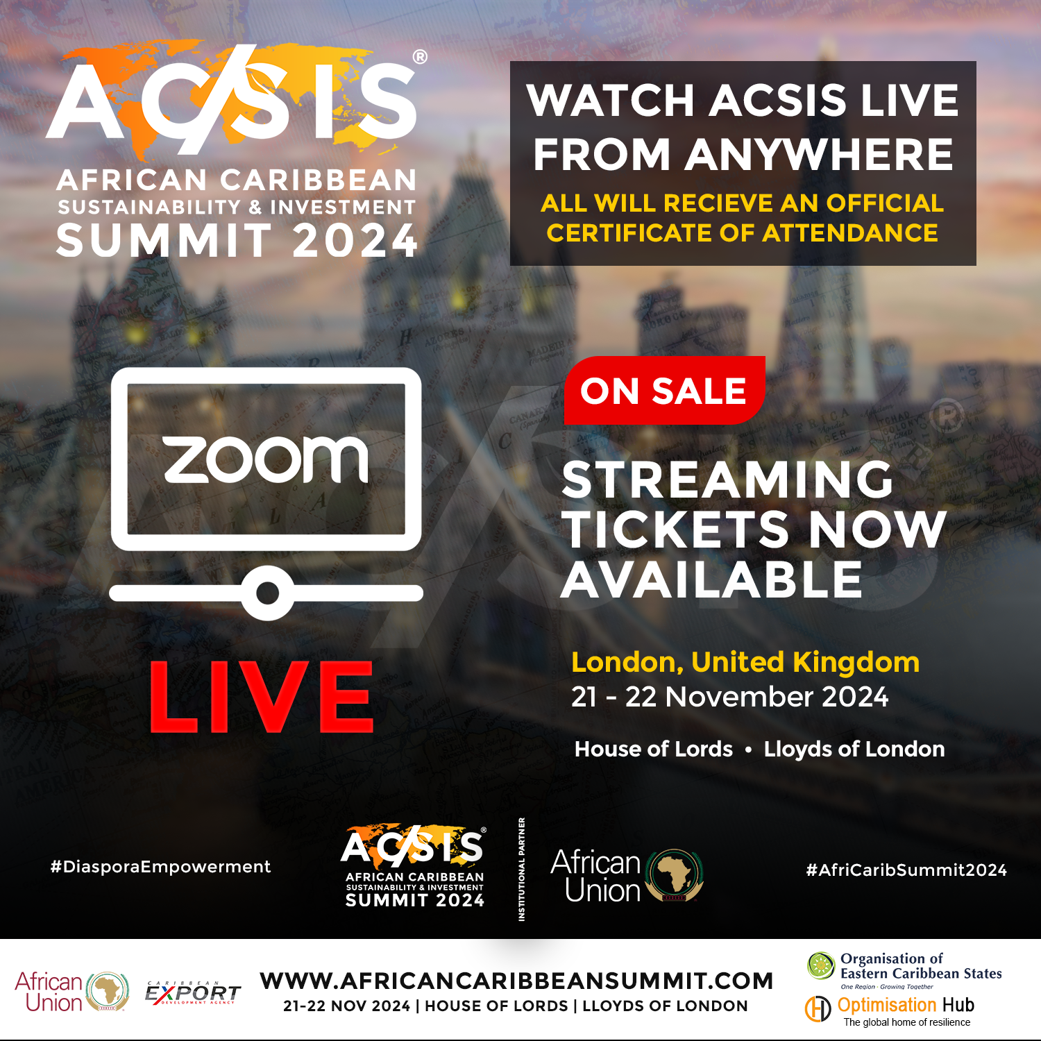 The African Caribbean Sustainability & Investment Summit (ACSIS) 2024 is breaking barriers by making its events accessible to audiences worldwide. Scheduled for Thursday 21st and Friday 22nd November, this landmark event will be hosted at two iconic London venues—the House of Lords and Lloyds of London—and streamed live online, enabling participation from the global diaspora.