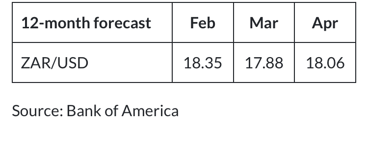 Despite these concerns, respondents in the BofA survey said the rand should reach R18.06/$ over the next 12 months (March: R17.88/$) – an improvement from the current R19.01/$.