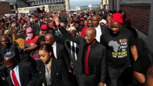 Malema was able to leave court and greet his supporters as the appeal process has now begun. Image Credit: Reuters