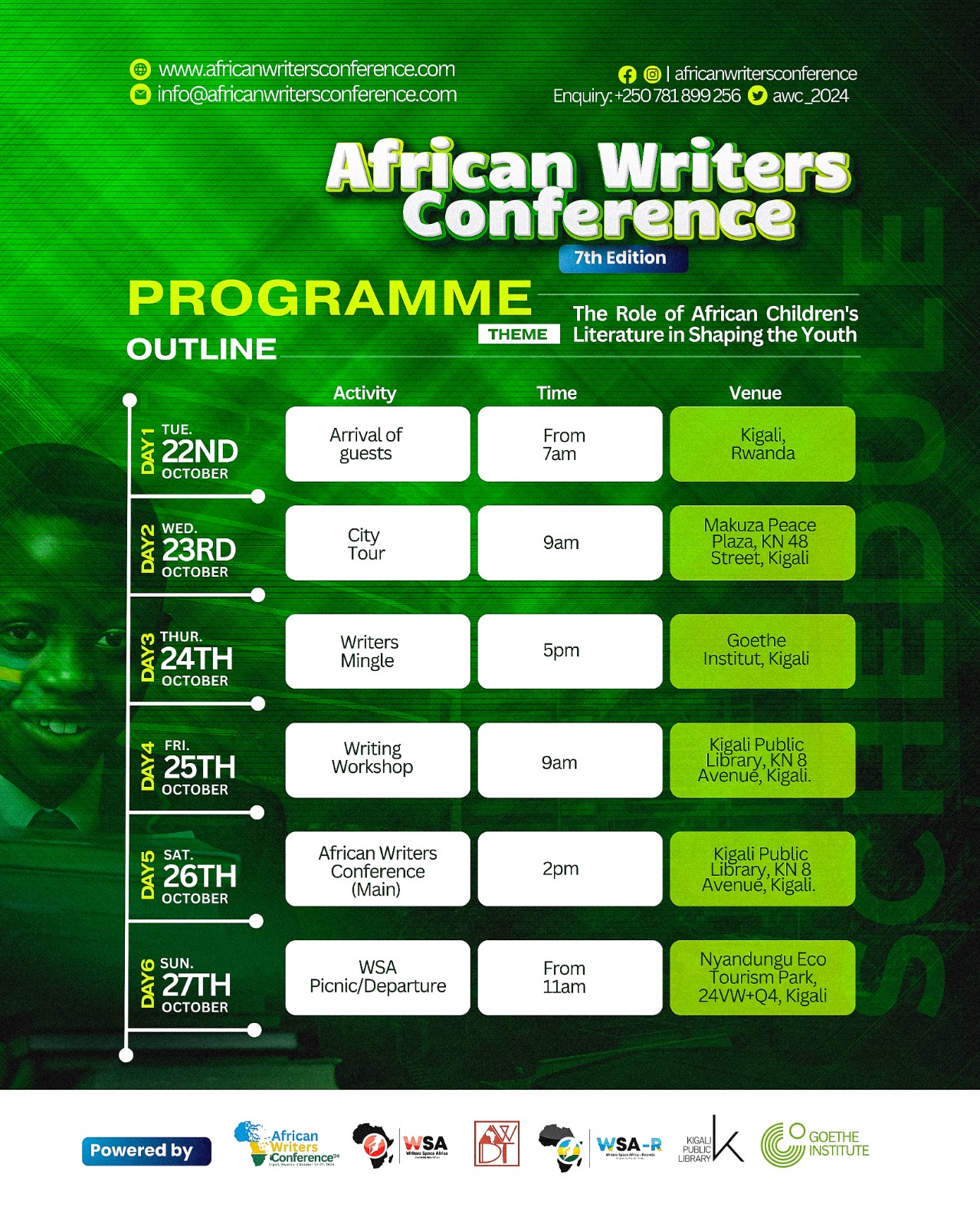 The 7th African Writers Conference and Awards, set to take place in Kigali, Rwanda, from October 22 to 27, 2024, promises to be an extraordinary event for writers, readers, publishers, and literary enthusiasts across the continent. Organized by the African Writers Development Trust (AWDT) in partnership with Writers Space Africa (WSA) and the Writers Space Africa – Rwanda Chapter (WSA-R), this year’s conference will bring together a diverse array of voices to celebrate the power and potential of African literature. With a focus on African children’s literature and its role in shaping the minds and identities of future generations, this conference stands as a critical milestone in the evolution of African storytelling.